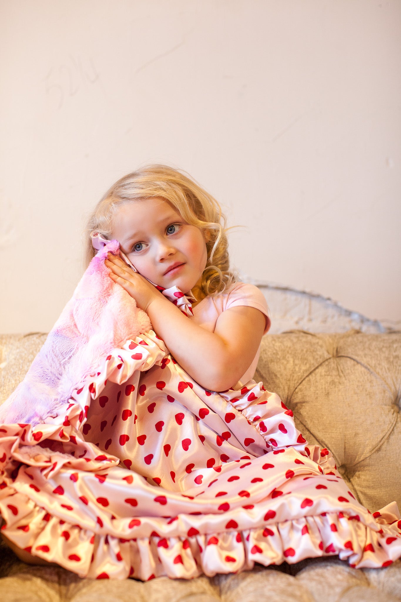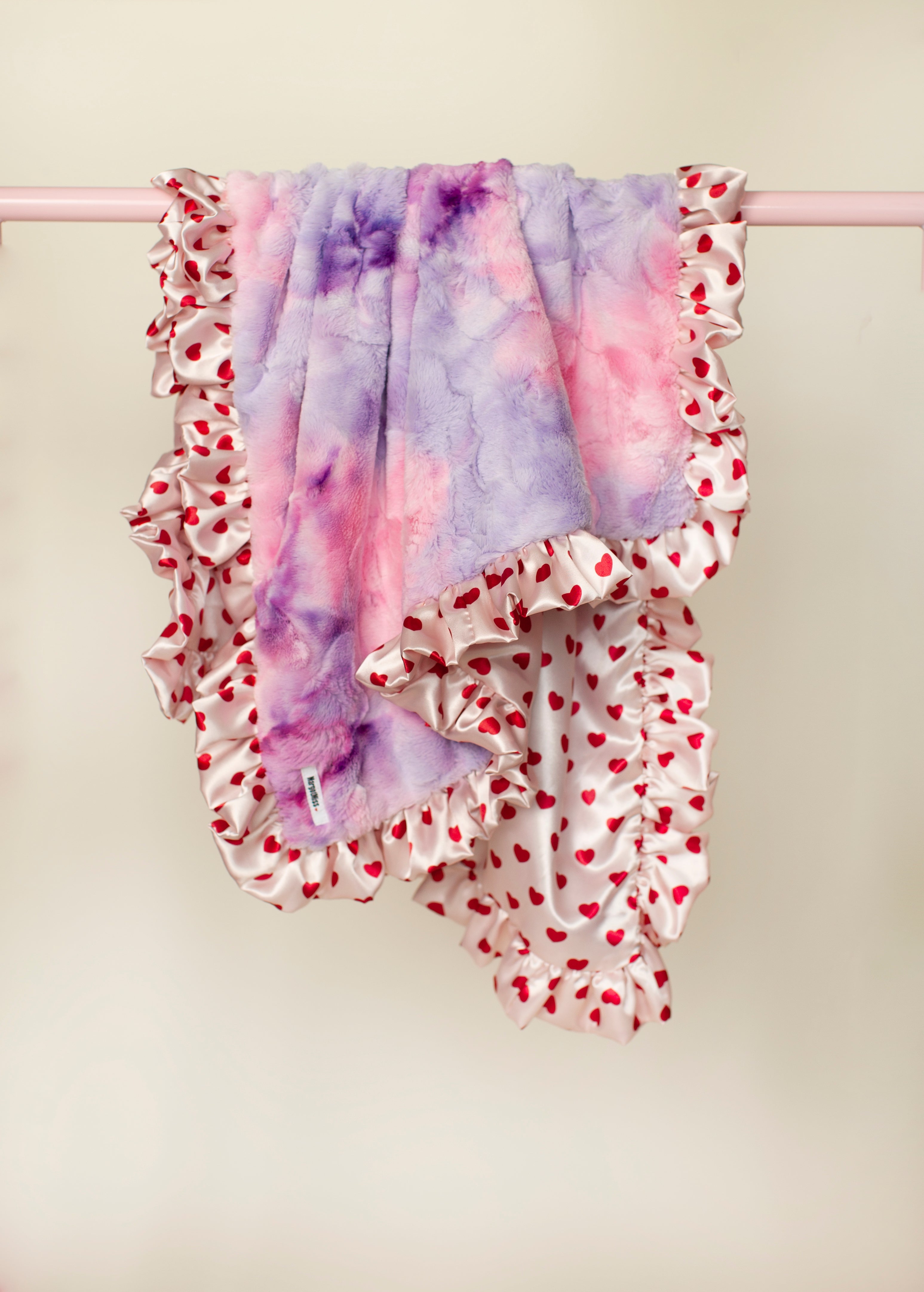 Our Hearts Blankie is part blanket, part lovey, and completely irresistible. Designed to be soft, cuddly, and lightweight, this unique snuggle blanket features our plush Unicorn minky paired with a beautifully lined and ruffled edge, finished in signature MargotMiss heart satin for an extra touch of luxury.