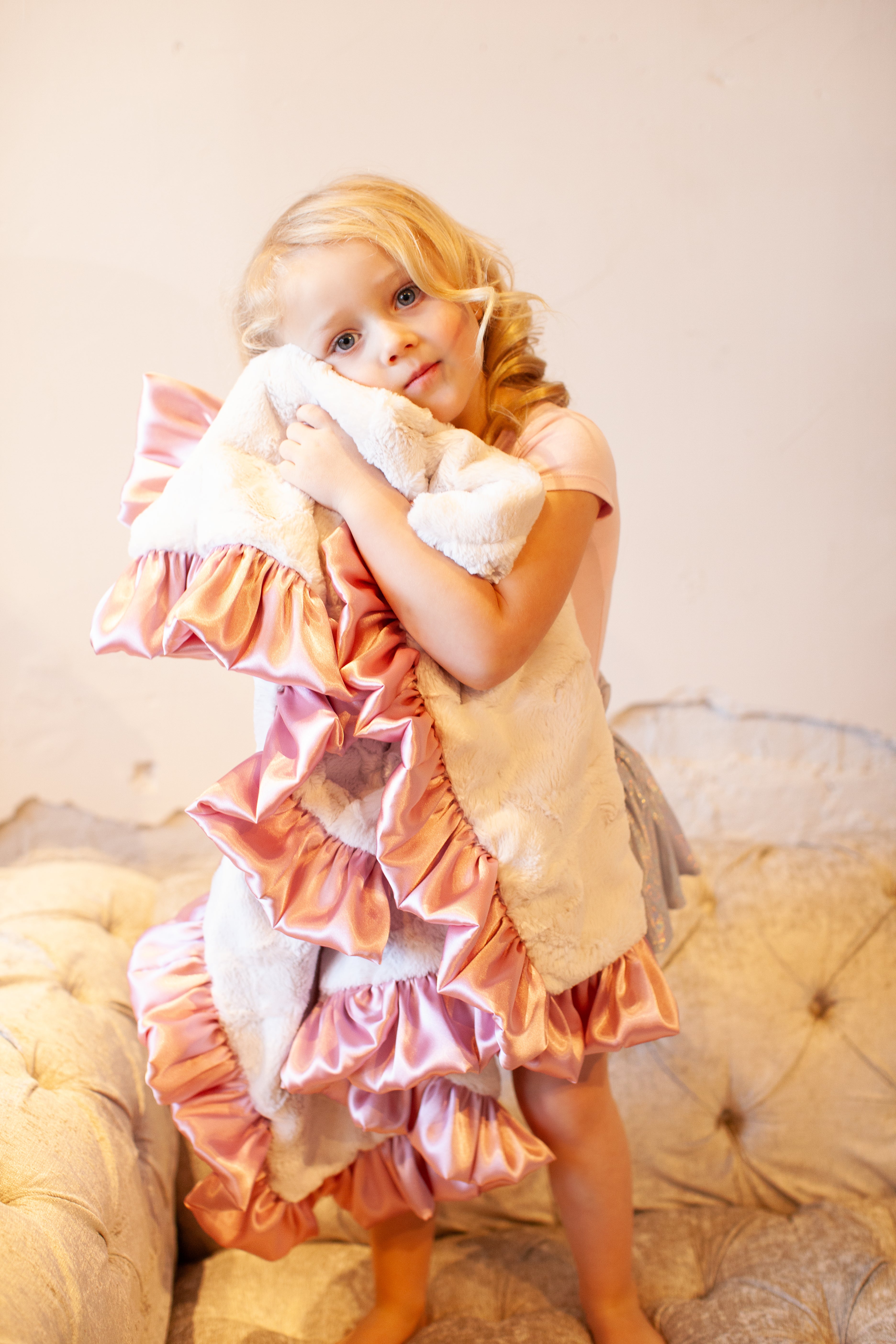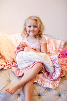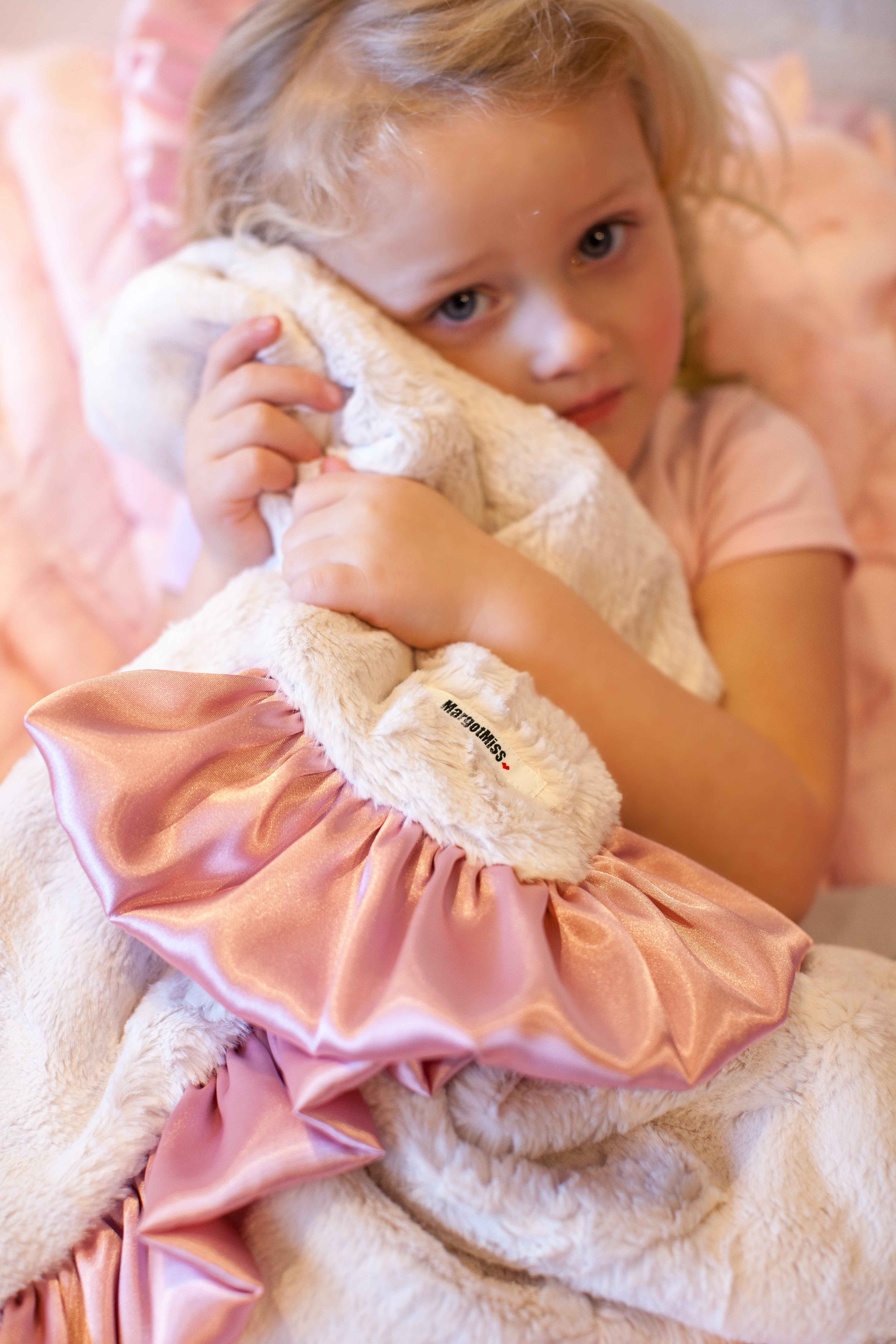 The MargotMiss ShortCakes MargotMinis Baby Blanket is a Sweet essential designed for everyday snuggles—from newborn cuddles to toddler comfort and beyond. Designed with an elegant color palette. A soft shade of Pink Silk Satin trim compliments the Off White Dreamy Cuddle plush Blanket.