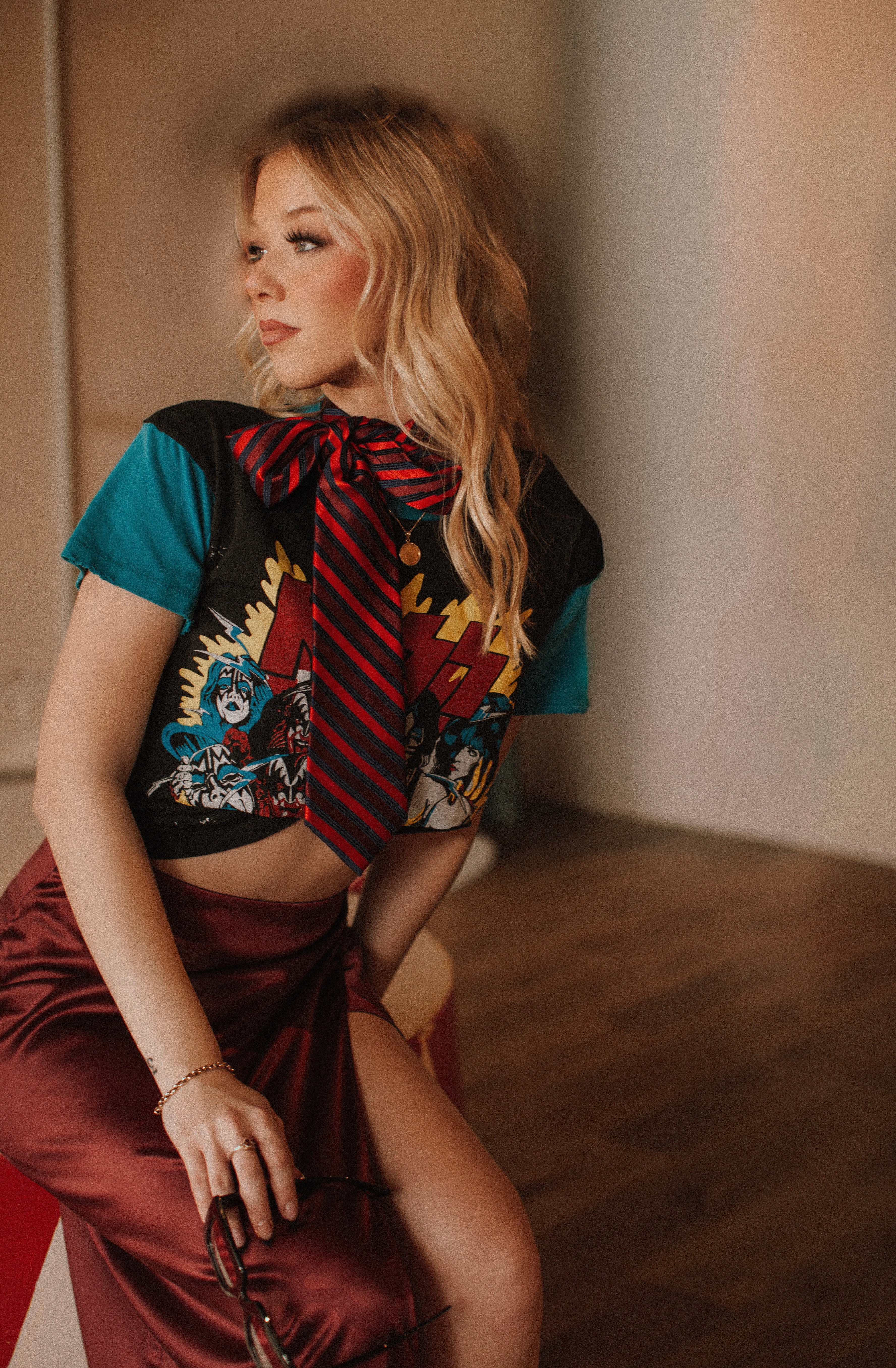 Champagne Satin Skinny Tie with Red Hearts