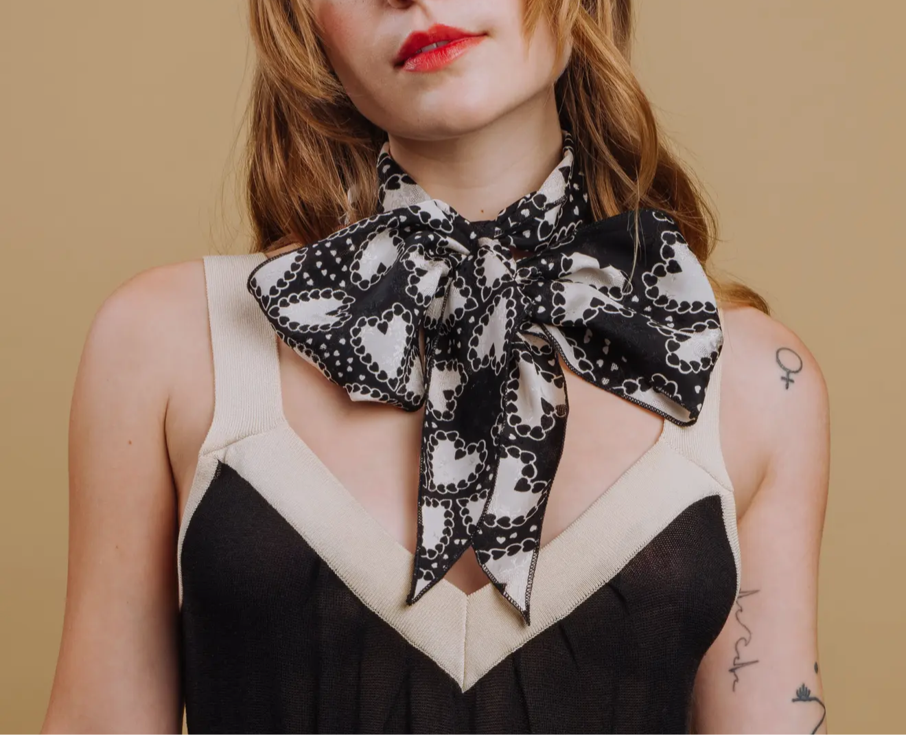 Champagne Silk Heart Tie – Wide Signature MargotMiss Scarf with Red Hearts