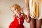 Crafted in smooth champagne satin and adorned with our signature bold red heart print, this piece blends feminine charm with timeless style. Measuring 1” wide and 55” long, it’s the perfect length for multiple styling options: