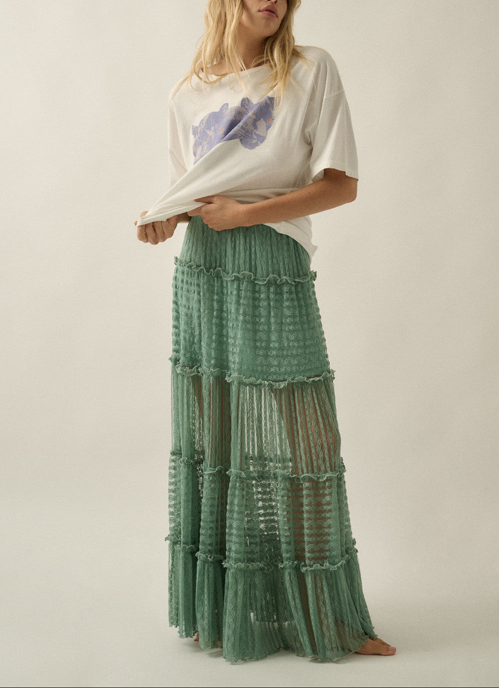 Striped Lace Tiered Maxi Skirt | Ruffle Lettuce-Edge Hem | Elastic Waist