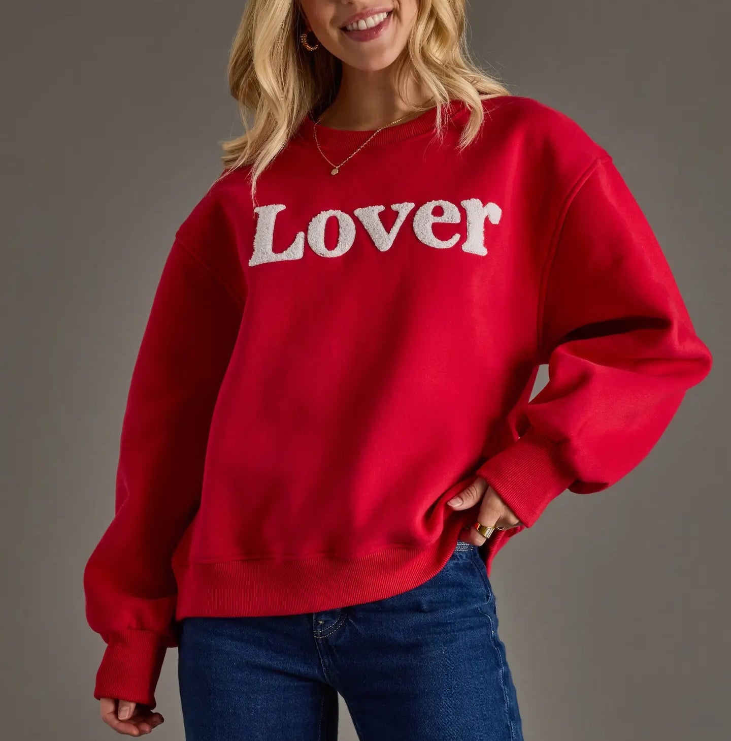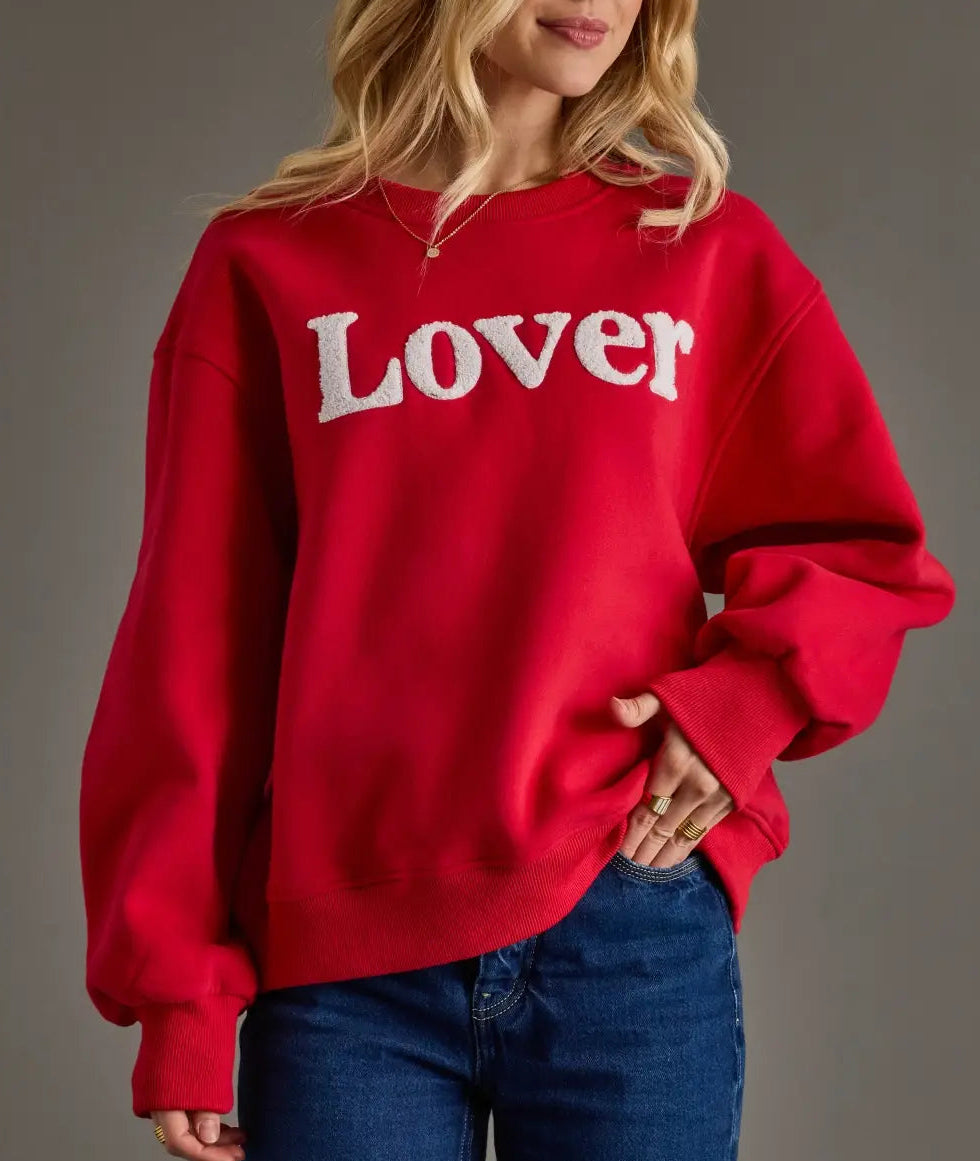 Red graphic sweatshirt with white textured chenille “Lover” lettering