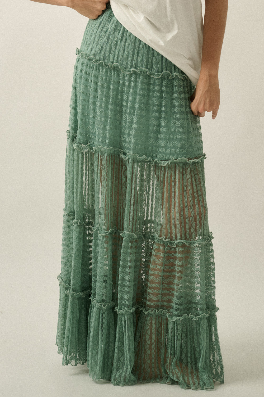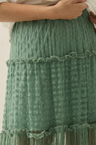 Striped Lace Tiered Maxi Skirt | Ruffle Lettuce-Edge Hem | Elastic Waist
