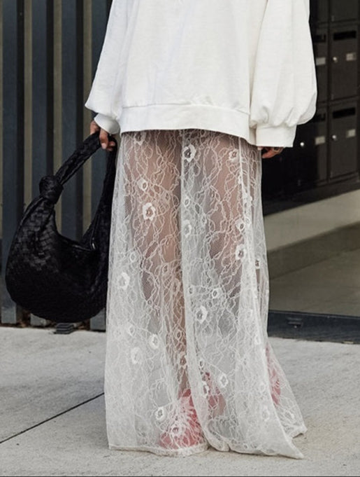 Make a bold statement in lace. This versatile see-through lace maxi skirt blends drama and detail — a must-have piece to layer, style, and repeat.